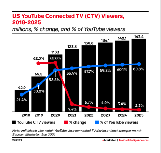 In 2021, half of YouTube viewers in the US watched on a connected TV. eMarketer forecasts that retail media and CTV will be among the fastest-growing digital ad channels this year.